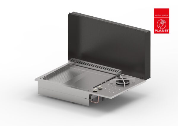 | Caractéristiques techniques | 2 Brûleurs à bande large – Allumage Piezzo électronique – Cheminée – Bac à graisse incliné intégré sur façade – Couvercle en série avec ou sans charnières en Inox316 – Caisson de combustion isolé de la structure pour la sécurité et la performance thermique – PGS : sécurité coupure gaz |