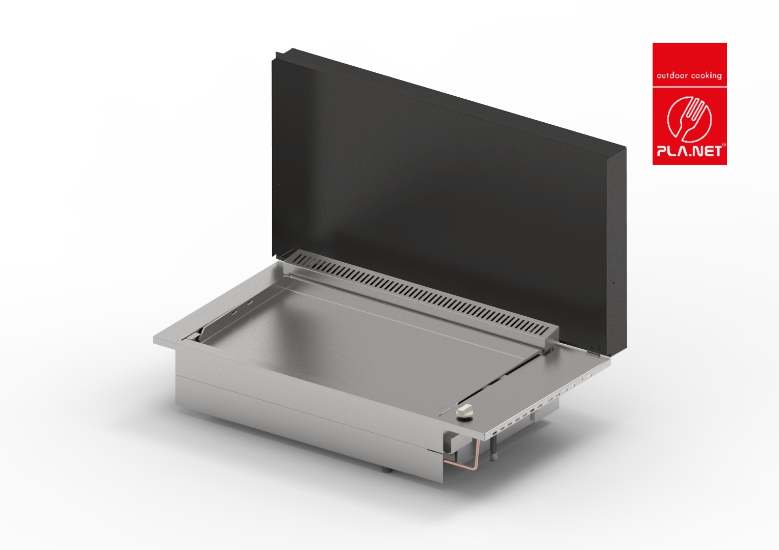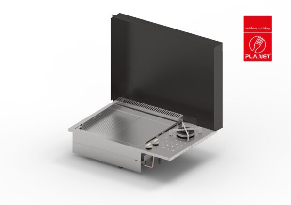 | Caractéristiques techniques | 3 Brûleurs à bande large – Allumage Piezzo électronique – Cheminée – Bac à graisse incliné intégré sur façade – Couvercle en série avec ou sans charnières en Inox316 + peinture noire – Caisson de combustion isolé de la structure pour la sécurité et la performance thermique – PGS : sécurité coupure gaz |